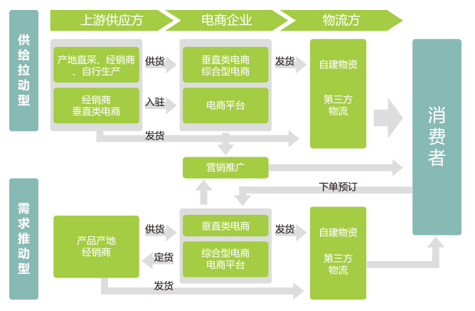 国内平台商包括:天猫喵鲜生、淘宝生态农业、京东生鲜商城;自营型包括;中粮我买网、顺丰优选、本来生活;垂直型:沱沱工社等