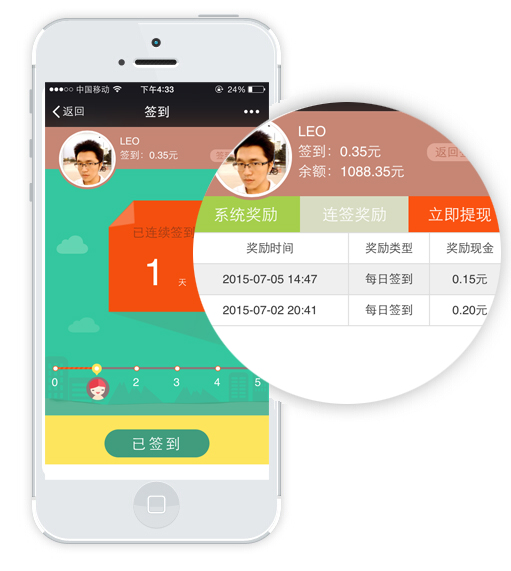 积分签到、现金签到,关注公众号的粉丝,即可点击签到,